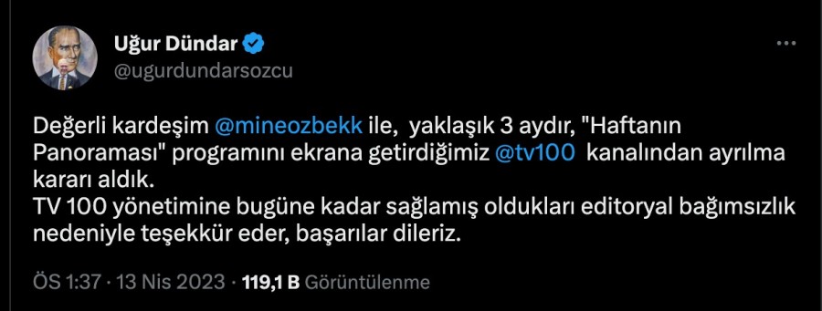 "Değerli kardeşim @mineozbekk ile, yaklaşık 3 aydır, "Haftanın Panoraması" programını ekrana getirdiğimiz @tv100 kanalından ayrılma kararı aldık. TV 100 yönetimine bugüne kadar sağlamış oldukları editoryal bağımsızlık nedeniyle teşekkür eder, başarılar dileriz."