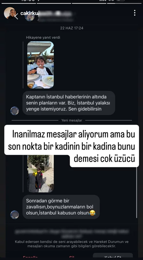 Galatasaray'ın başarılı kalecisi Uğurcan Çakır'ın eşi Kübra Çakır, "Bir kadının bir kadına bunu demesi çok üzücü" diyerek Instagram'dan kendisine gönderilen bir mesajı paylaştı.