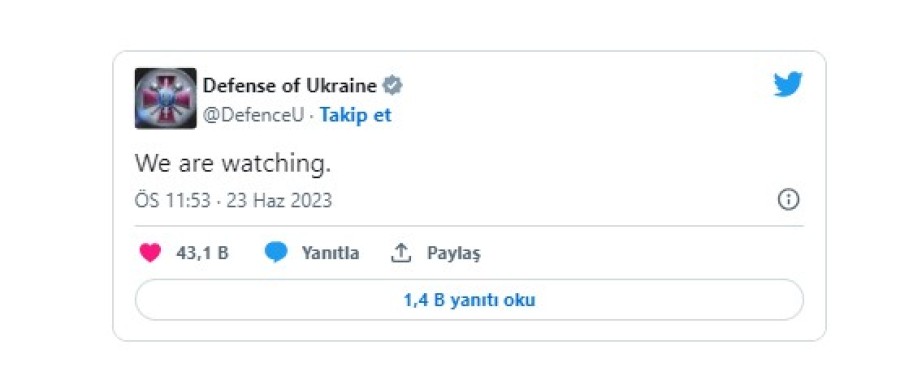 Rusya'da sıcak gelişmeler yaşanıyor. Wagner grubunun lideri Prigojin, Rus ordusunun cephe gerisindeki güçlerini vurduğunu öne sürdü. Rusya Savunma Bakanlığı iddiayı yalanladı. Bu gelişmeler yaşanırken Ukrayna Savunma Bakanlığı'ndan "İzliyoruz" paylaşımı geldi