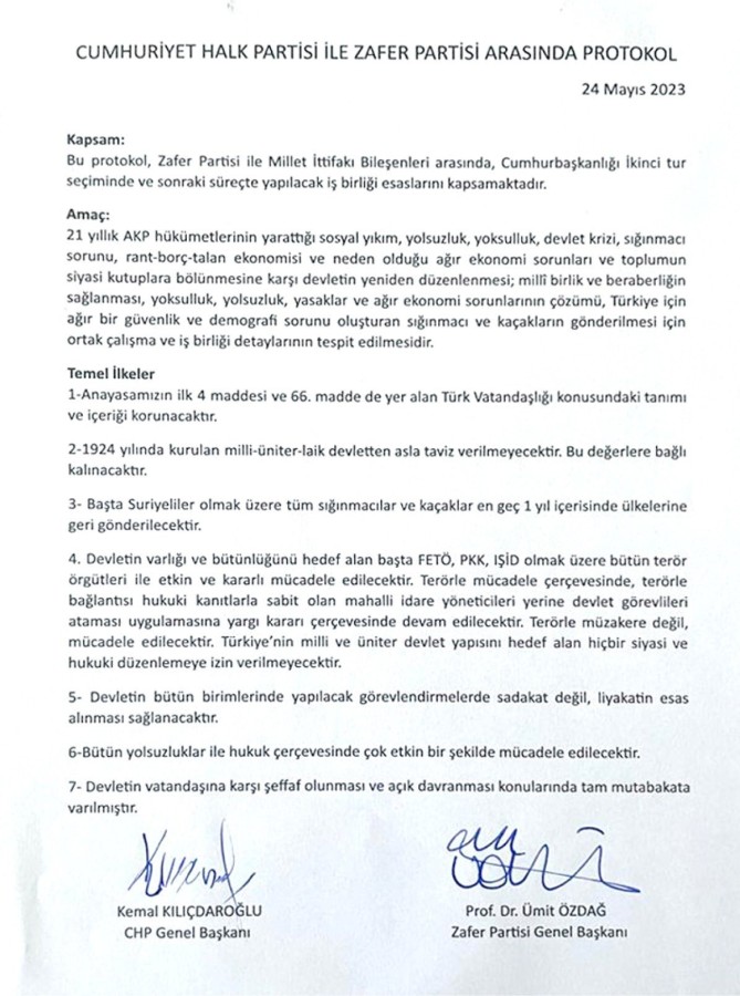 Aşağıda üzerinde çok konuşulan ancak ilk kez yayınlanan Zafer Partisi-CHP Protokolünün tamamının fotoğrafını göreceksiniz. Bu protokolu eleştiren 6'lı masa birleşenlerine ve CHP içinden protokola karşı çıkanlara cevap veriyorum. 14 Mayıs'ta yapılan seçimlerin 1. Turunu hem parlamento hem cumhurbaşkanlığı seçiminde kaybettiniz. 14 Mayıs seçimleri öncesinde Zafer Partisi ile her türlü görüşmeyi reddetmiştiniz.
