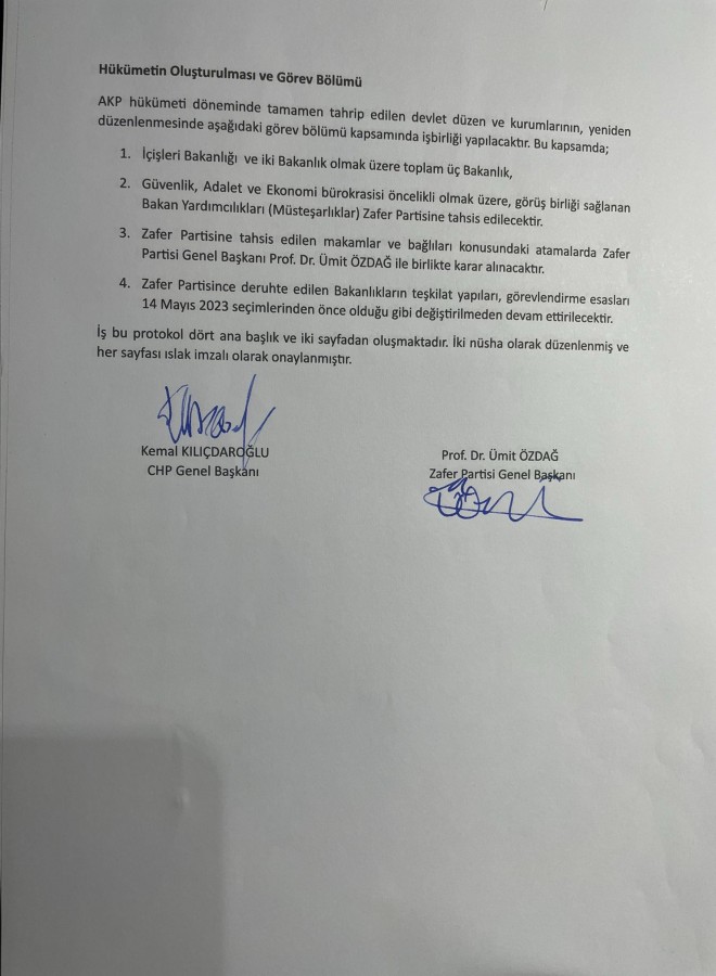 Zafer Partisi Genel Başkanı Cumhurbaşkanlığı seçimlerinde eski CHP Genel Başkanı Kemal Kılıçdaroğlu ile imzaladıkları protokolü paylaştı.