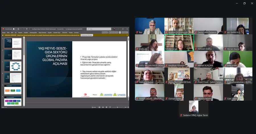 Projenin ilk eğitim faaliyeti olarak düzenlenen "İhracata Yönelik Satış Becerilerinin Geliştirilmesi" eğitimi, meyve sebze mamulleri ve yaş meyve sebze sektörlerinden firma temsilcilerinin katılımıyla 30-31 Mart 2026 tarihlerinde çevrim içi ortamda gerçekleştirildi.