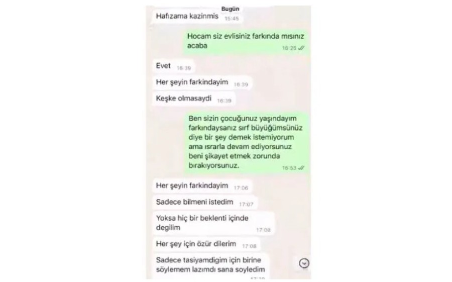 Ekran Haber'de yer alan bilgilere göre; "Sana bir şey itiraf etmem lazım. Ama söylemem doğru mu, onu bile bilmiyorum" diyerek gelen mesaja öğrenci, "Dinliyorum" yanıtını verince hiç beklemediği bir mesaj aldı. Mesajında M.Ç., "Hiç aklımdan çıkmıyorsun. Hele o gün kapıdan gülerek girişin... Hafızama kazınmış" ifadelerini kullandı..
