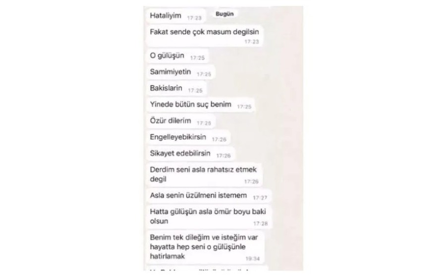 M.Ç., mesajlarının devamında hatalı olduğunu belirterek, "Fakat sen de çok masum değilsin. O gülüşün, bakışların, yine de tüm suç benim" dedi.