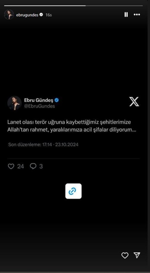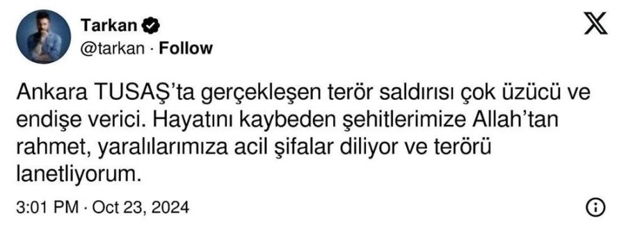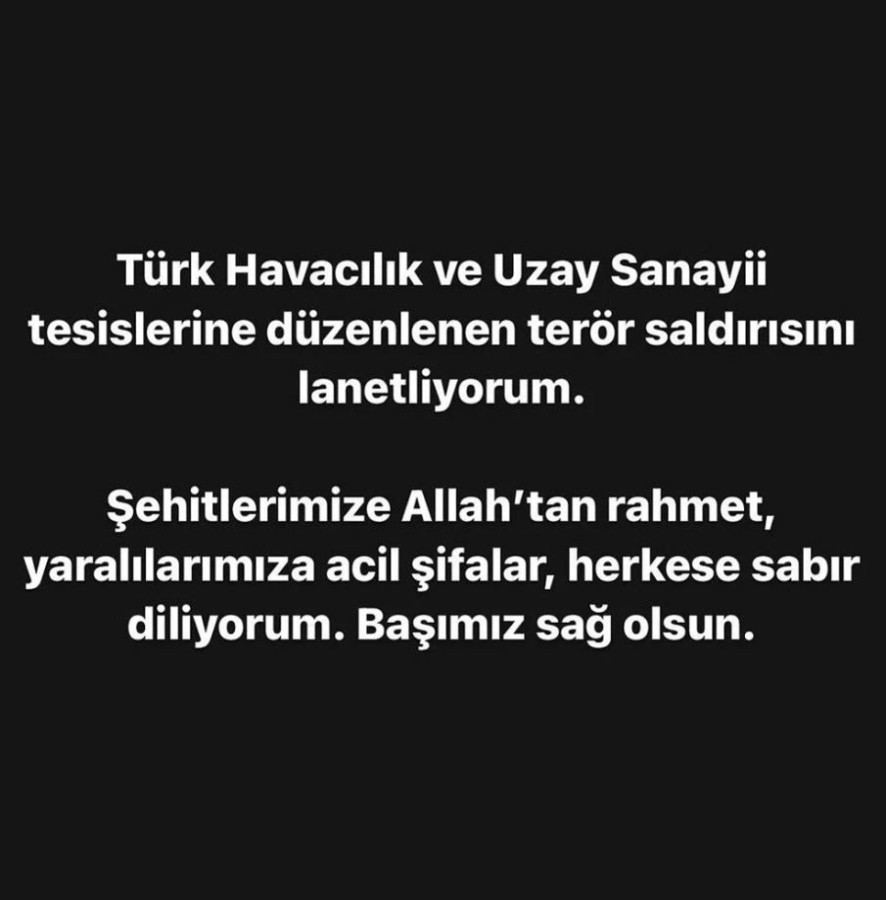 Ünlü isimler, TUSAŞ tesislerine düzenlenen terör saldırısını lanetleyerek şehit ailelerine baş sağlığı, yaralılara acil şifalar diledi. İşte ünlülerin paylaşımları...