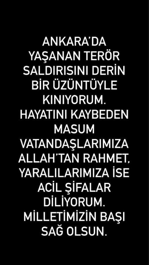 "Ankara'da yaşanan terör saldırısını derin üzüntüyle kınıyorum. Hayatını kaybeden masum vatandaşlarımıza Allah'tan rahmet, yaralılarımıza acil şifalar diliyorum. Milletimizin başı sağ olsun."