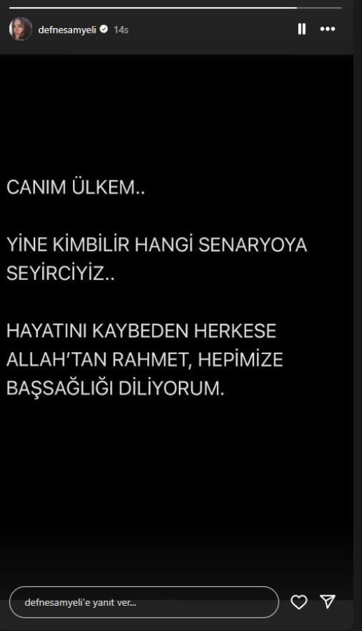 "Canım ülkem, kim bilir yine hangi senaryoya seyirciyiz...Hayatını kaybeden herkese Allah'tan rahmet, hepimize baş sağlığı diliyorum."