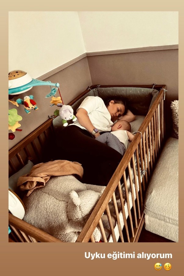 Oyuncu Aslı Enver, kızı Elay'ı uyutmaya çalışırken kendisinin beşikte yorgun düştüğü anı sosyal medya hesabından paylaştı.