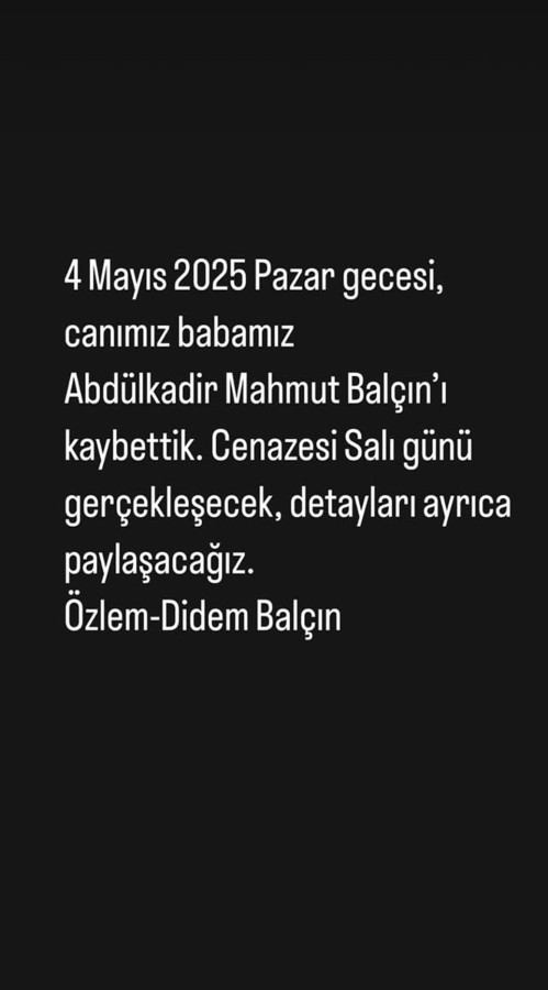 "4 Mayıs 2025 Pazar gecesi, canımız babamız Abdülkadir Mahmut Balçın'ı kaybettik. Cenazesi salı günü gerçekleşecek. Detayları ayrıca paylaşacağız. Özlem Balçın - Didem Balçın."