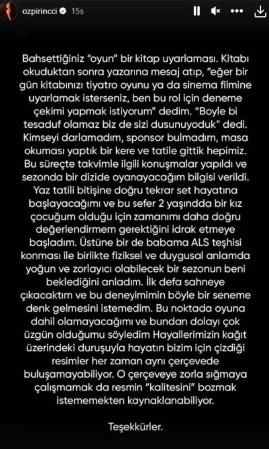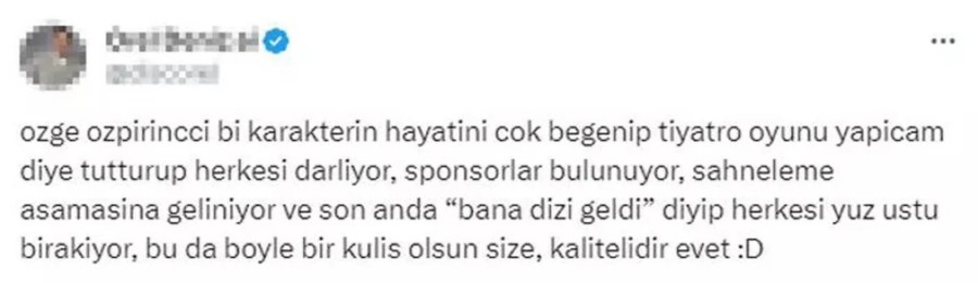 Söz konusu kişi, "Özge Özpirinçci bir karakterin hayatını çok beğenip 'Tiyatro oyunu yapacağım' diye tutturup herkesi darlıyor, sponsor bulunuyor, sahneleme aşamasında geliniyor ve son anda 'Bana dizi geldi' deyip herkesi yüzüstü bırakıyor. Bu da böyle bir kulis olsun size, kalitedir evet" dedi.