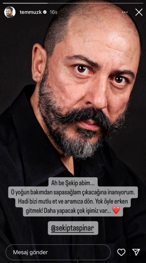 Oyuncunun menajeri Temmuz Karikutal Instagram'da yaptığı paylaşımda "Ah be Şekip abi... O yoğun bakımdan sağlam çıkacağına inanıyorum. Hadi biz mutlu et ve aramıza dön. Yok öyle erken gitmek... Daha yapacak çok işlerimiz var" ifadelerine yer verdi.