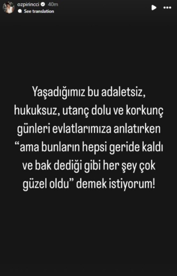 Özpirinçci, yaptığı paylaşımda, "Yaşadığımız bu adaletsiz, hukuksuz, utanç dolu ve korkunç günleri evlatlarımıza anlatırken 'ama bunların hepsi geride kaldı ve bak dediği gibi her şey çok güzel oldu' demek istiyorum!" ifadelerini kullandı.