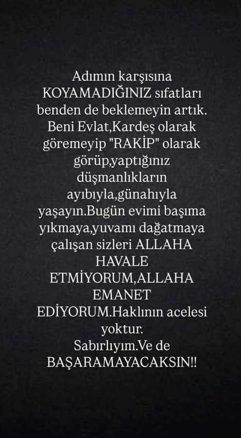 "Bugün evimi başıma yıkmaya, yuvamı dağıtmaya çalışan sizleri Allah'a havale etmiyorum, Allah'a emanet ediyorum. Haklının acelesi yoktur. Sabırlıyım ve de başaramayacaksınız!"