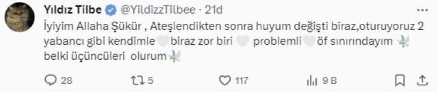 Daha sonra sosyal medya hesabından açıklama yapan Tilbe, "İyiyim Allaha Şükür. Ateşlendikten sonra huyum değişti biraz,oturuyoruz 2 yabancı gibi kendimle. Biraz zor biri, problemli, öf sınırındayım, belki üçüncüleri olurum." paylaşımıyla sevenlerini rahatlattı.