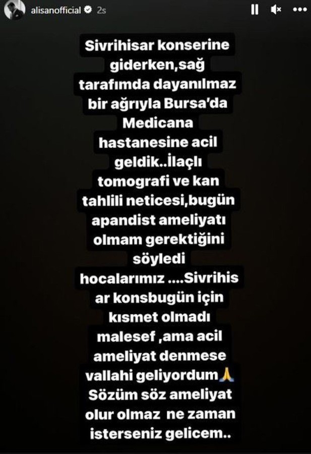 Instagram hesabından yaşadığı talihsiz olayı anlatan Alişan, "Sivrihisar konserine giderken sağ tarafımda dayanılmaz bir ağrıyla Bursa'da acile geldik. İlaçlı tomografi ve kan tahlili neticesi bugün apandisit ameliyatı olmam gerektiğini söyledi hocalarımız. Sivrihisar konseri bugün için kısmet olmadı maalesef. Acil ameliyat denmese vallahi geliyordum. Sözüm söz, ameliyat olur olmaz ne zaman isterseniz geleceğim" ifadelerini kullandı.