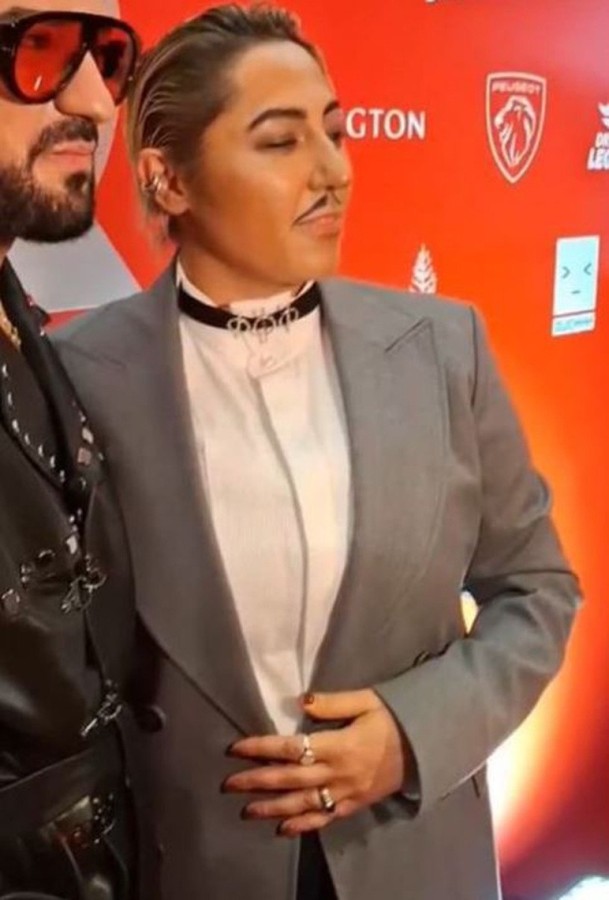 Kalben sahte bıyık takarak erkek görünümlü bir stille kırmızı halıya çıktı.