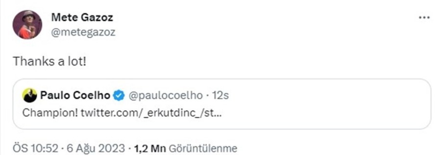 Dünyaca ünlü Brezilyalı yazar Paulo Coelho, Dünya Şampiyonu olan Mete Gazoz'u sosyal medyadan tebrik etti. Mete Gazoz da Coelho'ya teşekkür ettiğini paylaştı.