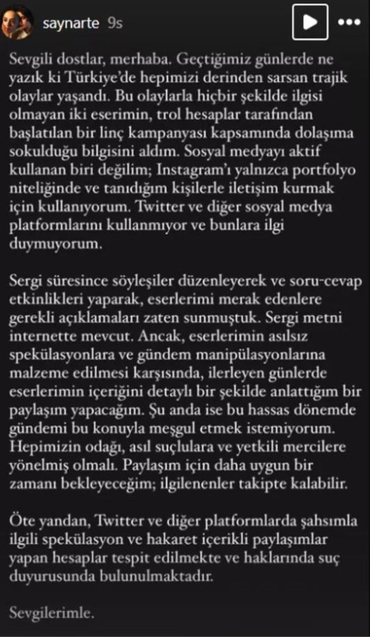 Sergi süresince söyleşiler düzenleyerek ve soru-cevap etkinlikleri yaparak, eserlerimi merak edenlere gerekli açıklamaları zaten sunmuştuk. Eserimin asılsız spekülasyonlara ve gündem manipülasyonlarına malzeme edilmesi karşısında, ilerleyen günlerde eserlerimin içeriğini detaylı bir şekilde anlattığım bir paylaşım yapacağım" ifadelerini kullandı.