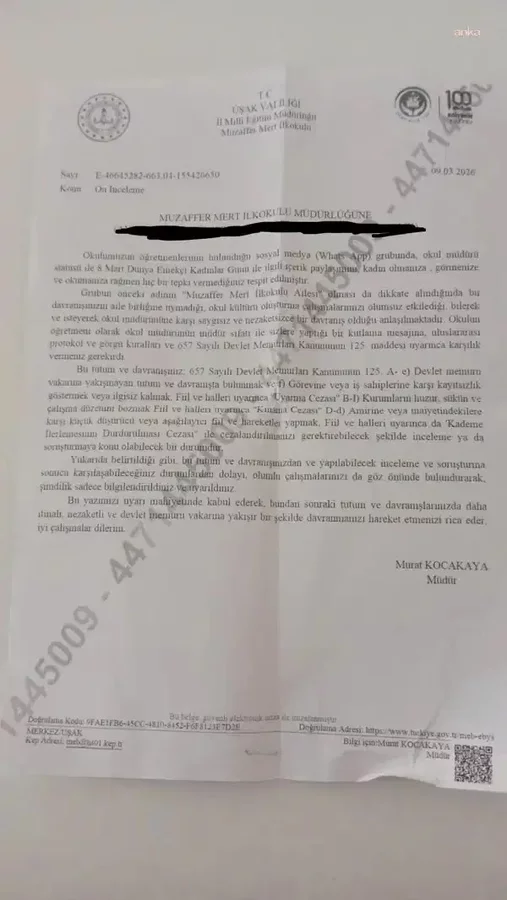 Uşak'ta Muzaffer Mert İlkokulu Müdürü Murat Kocakaya, WhatsApp grubunda paylaştığı mesajına tepki vermediği gerekçesiyle öğretmenlere resmi yazıyla uyarıda bulundu. Kocakaya, olayın tepki çekmesinin ardından görevden alındı.