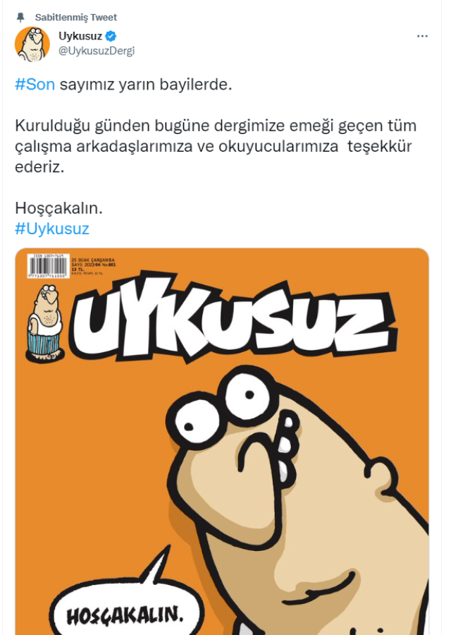 Haftalık mizah ve karikatür dergisi Uykusuz, yarın son sayılarının çıkacağını duyurdu.