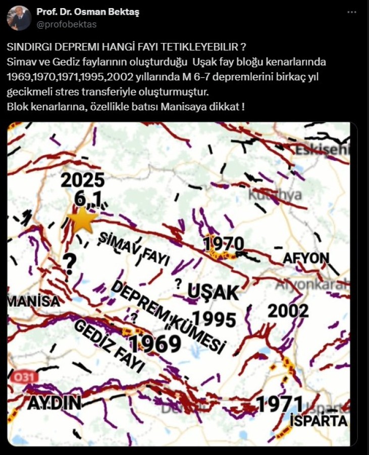 Depremin ardından gözler uzmanların açıklamalarına çevrildi. Geçmişte Balıkesir ve çevresi için uyarılarda bulunan Jeoloji Mühendisi Prof. Dr. Osman Bektaş, bu defa farklı bir kenti işaret etti. X hesabından yaptığı açıklamada, depremin 'Uşak deprem kümesi' olarak bilinen bölgede meydana geldiğini ifade eden Bektaş, "Simav Fayı 1970 yılında 7,2 büyüklüğünde Gediz depremini üretmiştir" hatırlatmasında bulundu.
