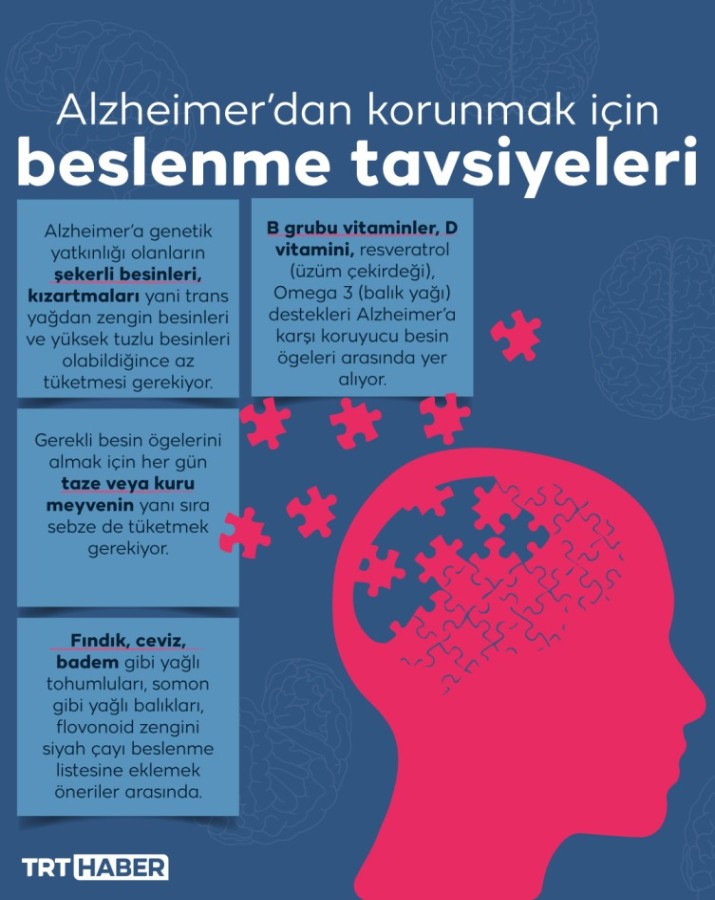 "B grubu vitaminler, D vitamini, resveratrol (üzüm çekirdeği), Omega 3 (balık yağı) destekleri Alzheimer'a karşı koruyucu besin öğeleri arasında yer alıyor. Eğer yeterli ve dengeli beslenemiyorsa, düzensiz bir beslenme alışkanlığı varsa bu besin ögeleri takviye olarak da alınabilir."