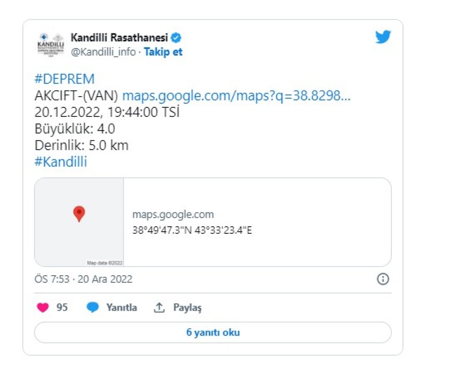 Kandilli Rasathanesi'nden edinilen bilgiye göre; "Van'da 4.0 büyüklüğünde deprem meydana geldi.