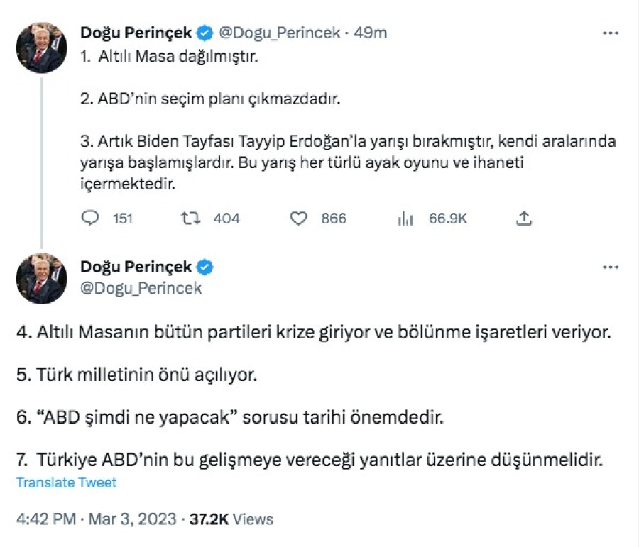 İyi Parti Genel Başkanı Meral Akşener'in, Altılı Masa'dan ayrıldıklarını açıklayarak, İstanbul Büyükşehir Belediye Başkanı Ekrem İmamoğlu ve Ankara Büyükşehir Belediye Başkanı Mansur Yavaş'ı aday olmaya davet etmesinin ardından Vatan Partisi Genel Başkanı Doğu Perinçek, "Altılı Masa dağılmıştır. ABD'nin seçim planı çıkmazdadır. Artık Biden Tayfası Tayyip Erdoğan'la yarışı bırakmıştır, kendi aralarında yarışa başlamışlardır" şeklinde ifade etti.