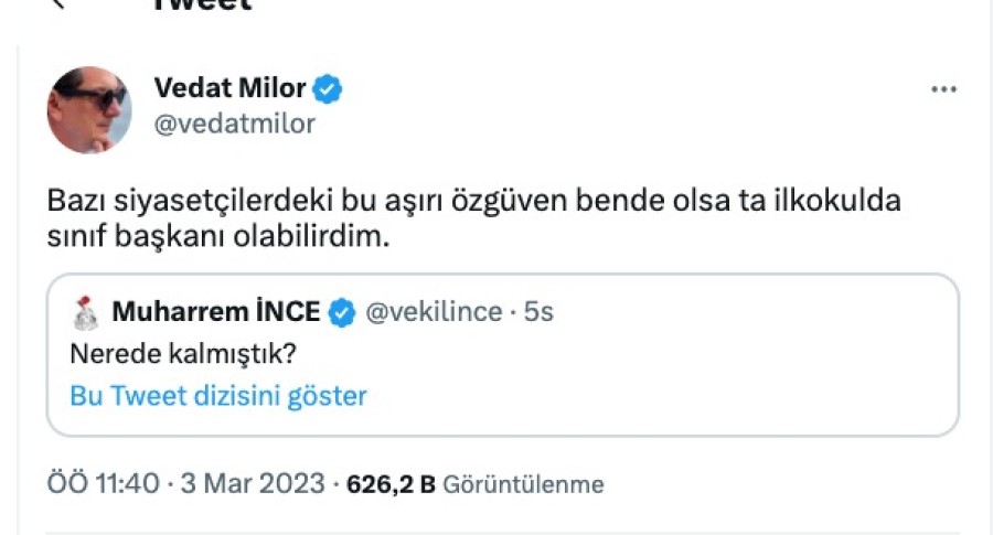 Gastronomi yazarı Vedat Milor, İnce'nin paylaşımını alıntılayarak, "Bazı siyasetçilerdeki bu aşırı özgüven bende olsa ta ilkokulda sınıf başkanı olabilirdim" ifadelerine yer verdi.