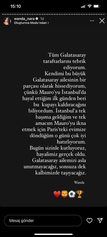 "Tüm Galatasaray taraftarlarını tebrik ediyorum. Kendimi bu büyük Galatasaray ailesinin bir parçası olarak hissediyorum, çünkü Mauro'yu İstanbul'da hayal ettiğim ilk günden beri bu kupayı kaldıracağını biliyordum. İstanbul'a tek başıma geldiğim ve tek amacım Mauro'yu ikna etmek için Paris'teki evimize döndüğüm o günü çok iyi hatırlıyorum. Bugün sizinle kutluyoruz, hayalimiz gerçek oldu. Galatasaray ailemizi asla unutmayacağız, sonsuza dek kalbimizde taşıyacağız."