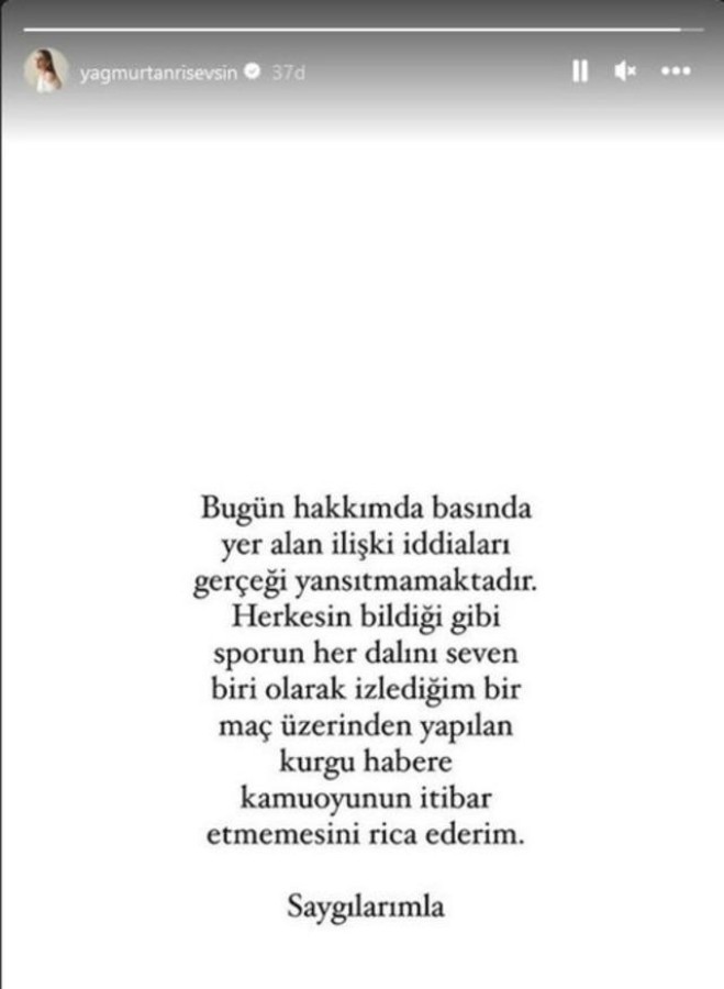 Yağmur Tanrısevsin, söz konusu iddiayla ilgili bir açıklama yaptı; "İlişki iddiaları gerçeği yansıtmamaktadır. Herkesin bildiği gibi; sporun her dalını seven biri olarak izlediğim bir maç üzerinden yapılan kurgu habere kamuoyunun itibar etmemesini rica ederim. Saygılarımla."