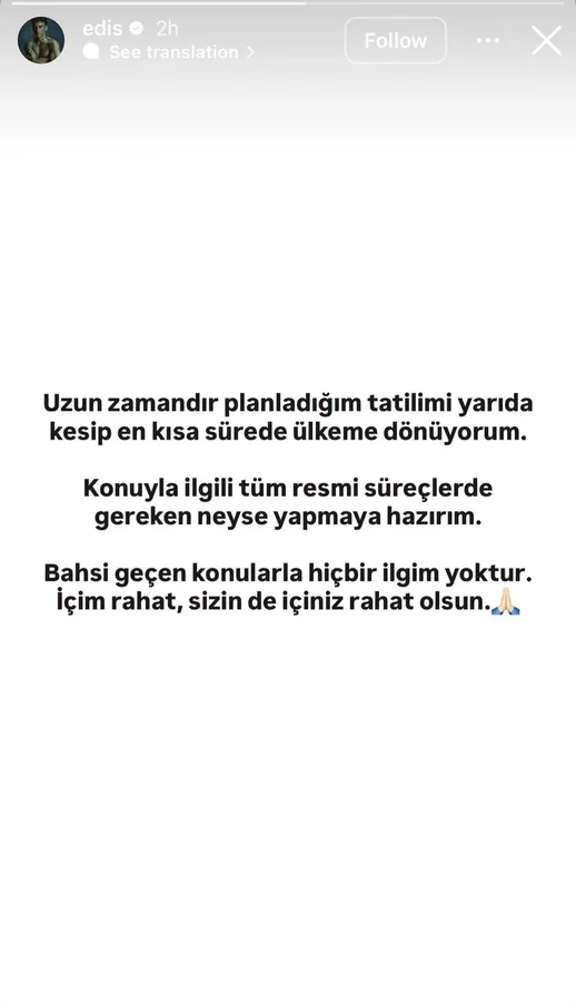 Hakkında yakalama kararı çıkarılan ünlü şarkıcı Edis Görgülü, konuya ilişkin ilk açıklamasını, sosyal medya hesabından yaptı. Görgülü, "Uzun zamandır planladığım tatilimi yarıda kesip en kısa sürede ülkeme dönüyorum. Konuyla ilgili tüm resmi süreçlerde gereken neyse yapmaya hazırım. Bahsi geçen konularla hiçbir ilgim yoktur. İçim rahat, sizin de içiniz rahat olsun" ifadelerini kullandı.