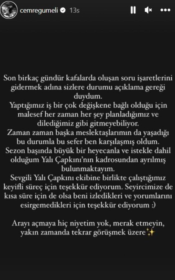 Zaman zaman başka meslektaşlarımın da yaşadığı bu durumla bu sefer ben karşılaşmış oldum. Sezon başında büyük bir heyecanla ve istekle dahil olduğum Yalı Çapkını'nın kadrosundan ayrılmış bulunmaktayım." cümlelerine yer verdi.