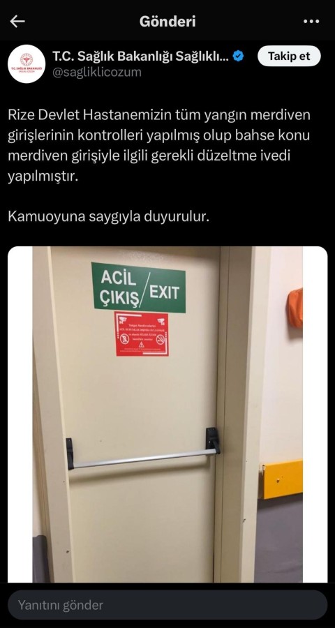 Konuya ilişkin Sağlık Bakanlığı'nın sosyal medya hesabından açıklama yapıldı. Açıklamada, "Rize Devlet Hastanemizin tüm yangın merdiven girişlerinin kontrolleri yapılmış olup bahse konu merdiven girişiyle ilgili gerekli düzeltme ivedi yapılmıştır. Kamuoyuna saygıyla duyurulur" ifadelerine yer verdi.