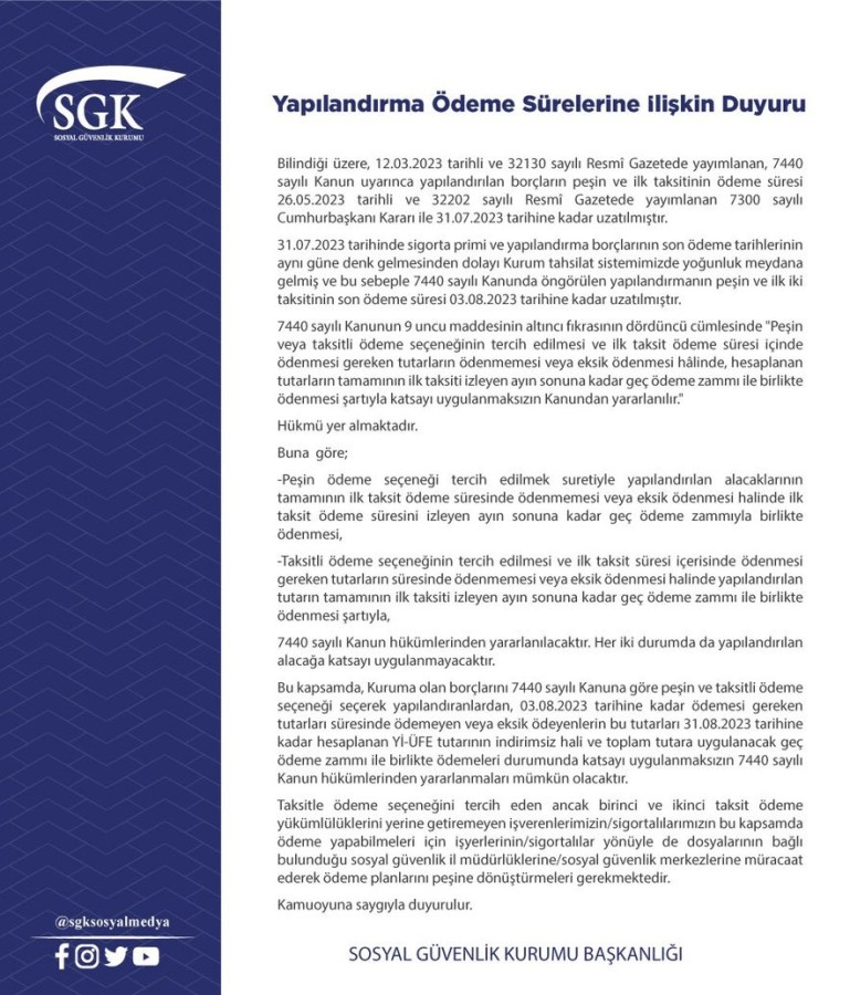 Sosyal Güvenlik Kurumu (SGK), kuruma olan borçlarını peşin ve taksitli ödeme seçeneği ile yapılandıranlardan, 3 Ağustos'a kadar ödemesi gereken tutarları ödemeyen veya eksik ödeyenlerin bu tutarları 31 Ağustos'a kadar hesaplanan Yİ-ÜFE tutarının indirimsiz hali ve toplam tutara uygulanacak geç ödeme zammıyla birlikte ödemeleri durumunda katsayı uygulanmaksızın 7440 sayılı Bazı Alacakların Yeniden Yapılandırılması ile Bazı Kanunlarda Değişiklik Yapılmasına Dair Kanun hükümlerinden yararlanacaklarını aktardı.