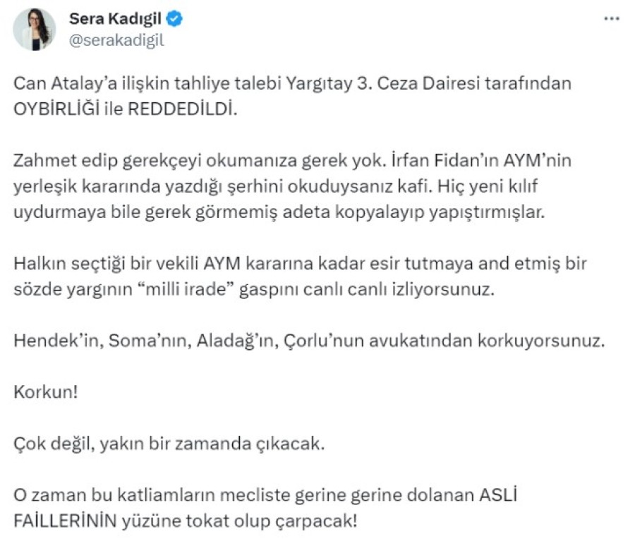 "Can Atalay'a ilişkin tahliye talebi Yargıtay 3. Ceza Dairesi tarafından oybirliği ile reddedildi. Zahmet edip gerekçeyi okumanıza gerek yok. İrfan Fidan'ın AYM'nin yerleşik kararında yazdığı şerhini okuduysanız kafi. Hiç yeni kılıf uydurmaya bile gerek görmemiş adeta kopyalayıp yapıştırmışlar. Halkın seçtiği bir vekili AYM kararına kadar esir tutmaya and etmiş bir sözde yargının "milli irade" gaspını canlı canlı izliyorsunuz. Hendek'in, Soma'nın, Aladağ'ın, Çorlu'nun avukatından korkuyorsunuz. Korkun! Çok değil, yakın bir zamanda çıkacak. O zaman bu katliamların mecliste gerine gerine dolanan asli faillerinin yüzüne tokat olup çarpacak!"