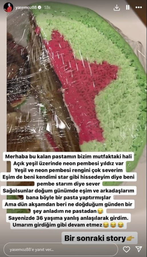 Sakallıoğlu, gelen yorumlar üzerine sessizliğini bozarak, "Merhaba bu kalan pastamın bizim mutfaktaki hali... Açık yeşil üzerinde neon pembesi yıldız var. Yeşil ve neon pembesi rengini çok severim, eşim de beni kendimi 'star' gibi hissedeyim diye beni 'pembe starım' diye sever. Sağ olsunlar, doğum günümde eşim ve arkadaşlarım bana böyle bir pasta yaptırmışlar. Ama dün akşamdan beri ne doğduğum günden bir şey anladım ne de pastadan. Sayenizde 36 yaşına yanlış anlaşılarak girdim. Umarım girdiğim gibi devam etmez" dedi.