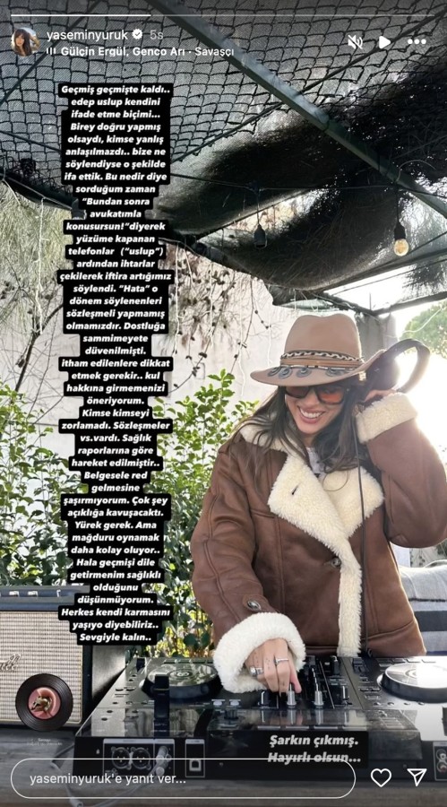 "Yasemin Yürük, sözlerine "Bize ne söylendiyse o şekilde ifade ettik. Bu nedir diye sorduğum zaman 'Bundan sonra avukatımla konuşursun' diyerek yüzüme kapanan telefonlar, ardından ihtarlar çekilerek iftira attığımız söylendi. Hata o dönem söylenenleri sözleşmeli yapmamış olmamızdır. Dostluğa, samimiyete güvenilmişti. İtham edilenlere dikkat etmek gerekir... Kul hakkına girmemenizi öneriyorum. Kimse kimseyi zorlamadı. Sözleşmeler vs. vardı. Sağlık raporlarına göre hareket edilmiştir. Belgesele red gelmesine şaşırmıyorum. Çok şey açıklığa kavuşacaktı. Yürek gerek! Ama mağduru oynamak daha kolay oluyor... Hala geçmişi dile getirmenin sağlıklı olduğunu düşünmüyorum. Herkes kendi karmasını yaşıyor diyebiliriz, sevgiyle kalın. Şarkın çıkmış hayırlı olsun" diye devam etti.