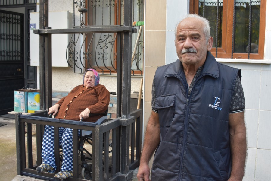 Eşi Meryem Okur'u evinin dışına yaptığı asansör dışarı çıkaran Okur, "Bu asansör sayesinde eşimi evden dışarı çıkarabiliyorum. Temiz hava alması için dışarıya çıkarıyorum, eşe dosta götürüyorum. Eğer bu asansör olmasaydı, eşimi evden dışarı çıkarma imkanım yoktu.