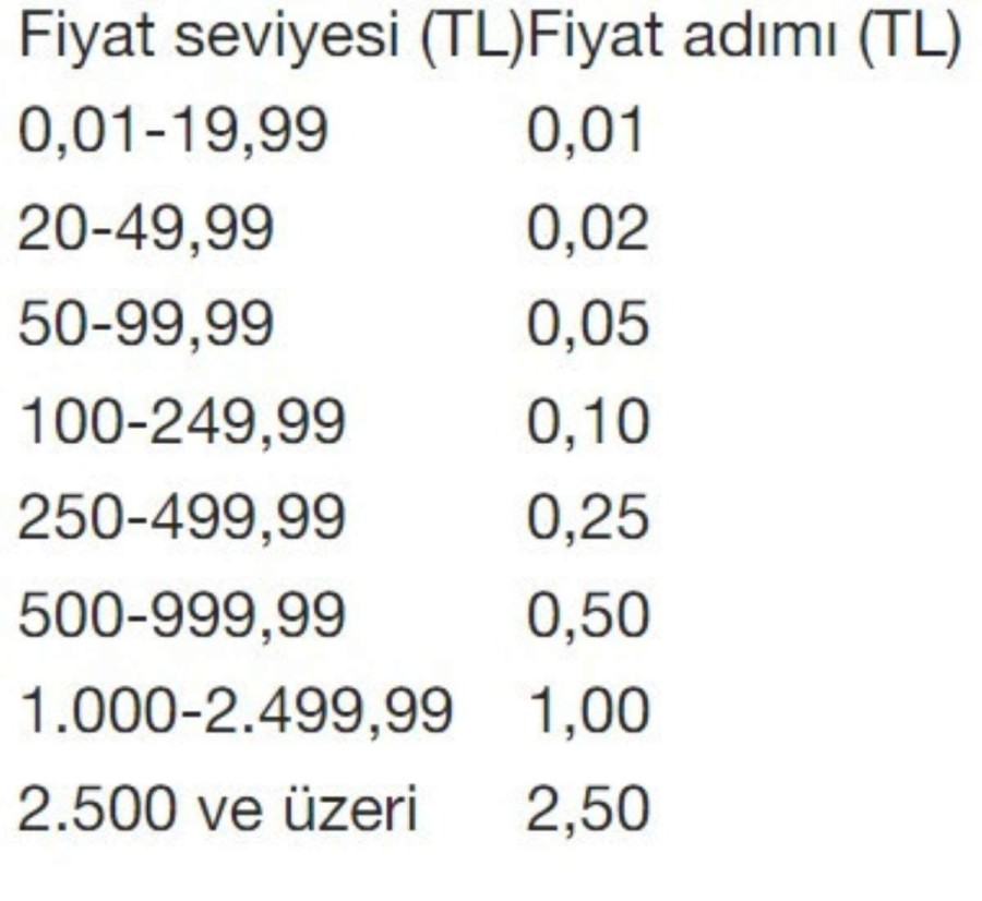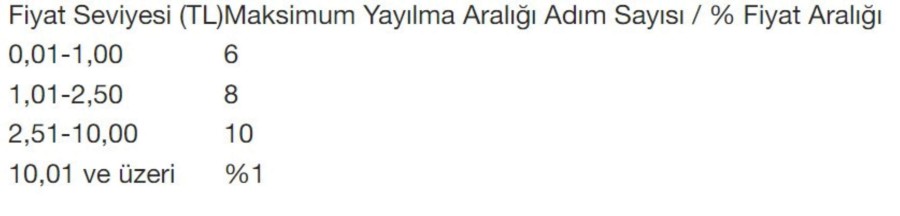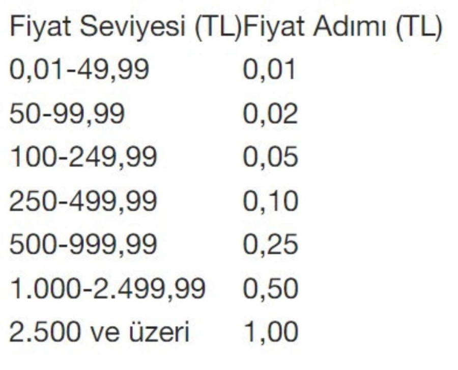 "Pay Piyasasında işlem gören sermaye piyasası araçlarında gerçekleşen işlemler esnasında uyulması gereken fiyat adımları ile piyasa yapıcıların kotasyon girişlerinde tabi oldukları maksimum kotasyon yayılma aralıkları ve borsa yatırım fonlarının işlem gördükleri seans akışı içerisinde birtakım değişikliklere gidilmiştir. Buna göre, paylar, yeni pay alma hakları, gayrimenkul sertifikaları, sahipliğe dayalı kira sertifikaları, borsa yatırım fonları, gayrimenkul yatırım fonları ve girişim sermayesi yatırım fonları işlem sıralarında geçerli olan fiyat adımı uygulaması aşağıdaki tablolarda yer aldığı şekilde yeniden düzenlenmiştir."