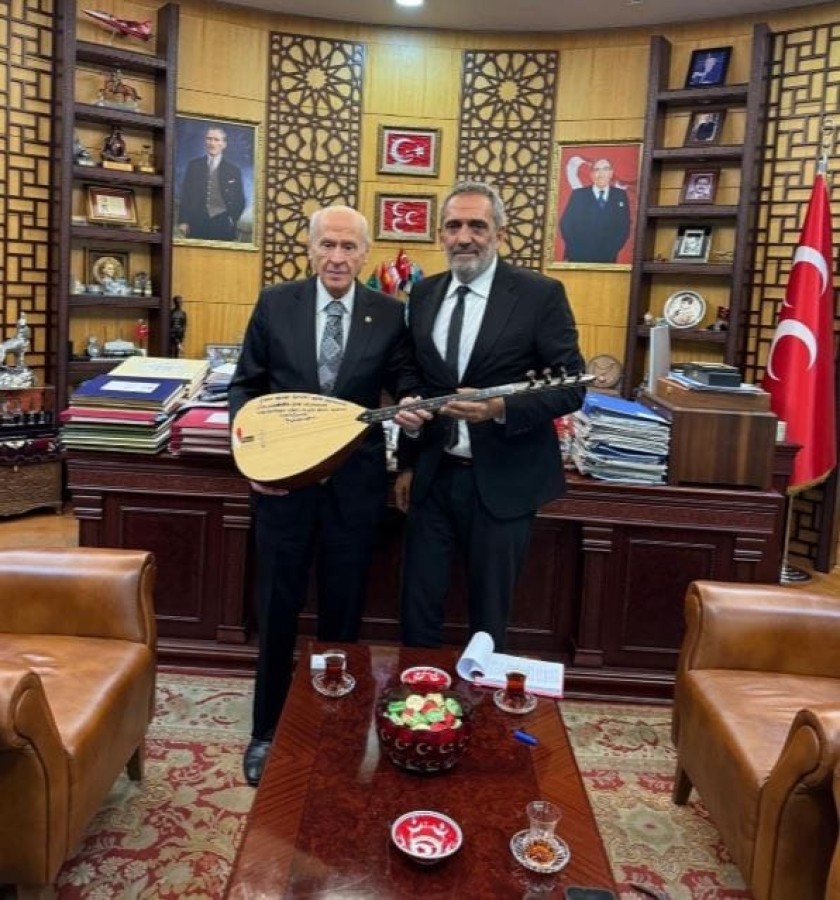 Bingöl, Bahçeli'ye makamında bağlama çalıp, sonra da aynı bağlamayı hediye etti.