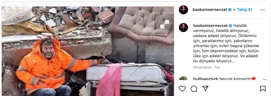 Yazar Ahmet Ümit Instagram hesabından yaptığı paylaşımda, "Helallik vermiyoruz, helallik almıyoruz, sadece adalet istiyoruz. Ölülerimiz için, yaralılarımız için, yakınlarını yitirenler için, evleri başına çökenler için, tüm depremzedeler için, bütün ülke için adalet istiyoruz. Ve adaleti bu dünyada istiyoruz..." ifadelerine yer verdi.