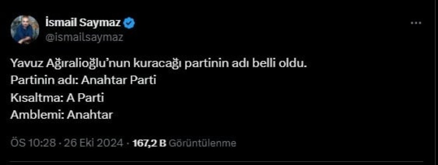 Geçtiğimiz yıl İYİ Parti'den istifa eden Yavuz Ağıralioğlu'nun kuracağı partinin ismi, kısaltması ve amblemini İsmail Saymaz açıkladı.