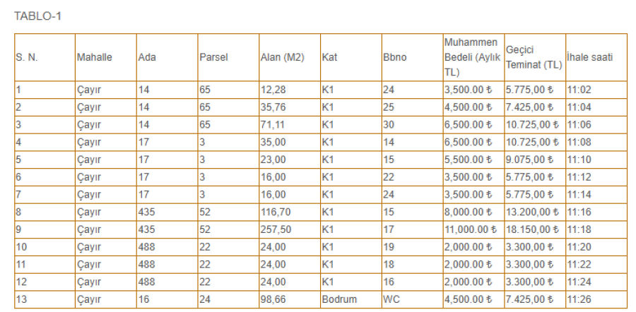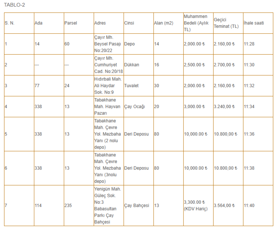 "Belediyemiz tarafından 20 adet taşınmaz 2886 Sayılı Devlet İhale Kanununun 45. Maddesi gereği açık arttırma usulü ile TABLO-1'dekiler 55 aylığına TABLO-2'dekiler 3 (üç) yıllığına kiralanacaktır.