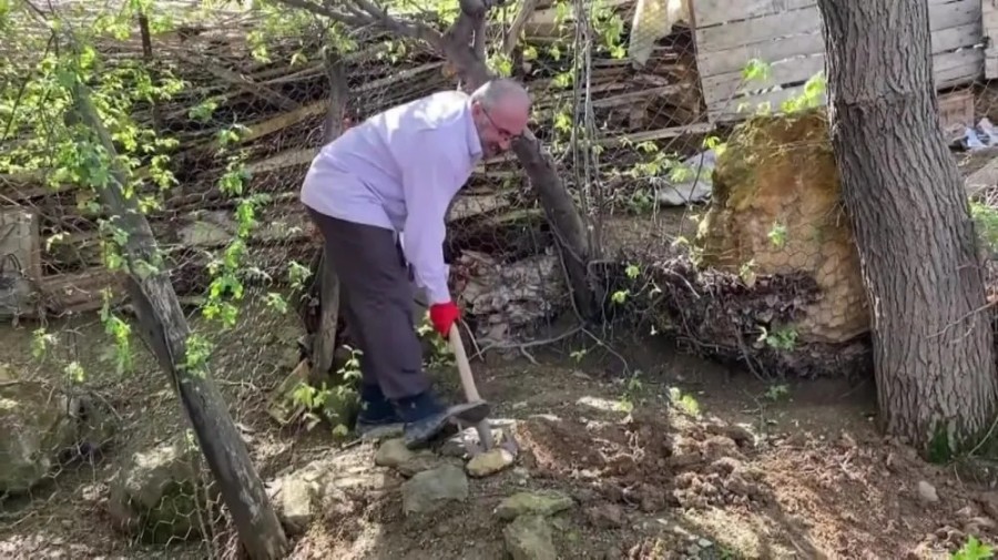 Kürekle kazıp 5 yıl önce gömdüğü küpü çıkarıp içindeki çökeleğin bozulmadığına sevinen Karakuş, "Satmaya kalksam Amerika bile 'Allah Allah' der. Beş yıllık çökelek dünya tarihinde belki de hiç yoktur.