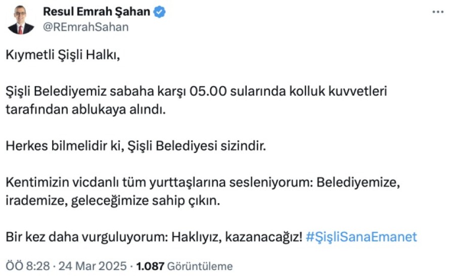 Tutuklanma kararının ardından yerine kayyum atanan Şişli Belediye Başkanı Resul Emrah Şahan, sosyal medya hesabından açıklamada bulundu. Şahan, paylaşımında yurttaşlara seslenerek, "Belediyemize, irademize, geleceğimize sahip çıkın" dedi.