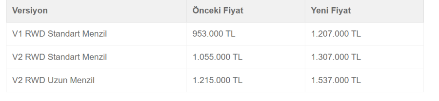 Satışa sunulduğu andan itibaren giriş seviyesi olarak fiyatı 953 bin TL olan V1 RWD Standart Menzil seçeneği artık 1.207.000 TL satış fiyatına sahip. Togg T10X zamlı fiyatlar şöyle: