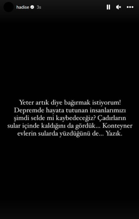 Şarkıcı Hadise Açıkgöz, Şanlıurfa ve Adıyaman'da meydana gelen sel falaketinde yaşanan can kayıpları üzerine tepki gösterdi.