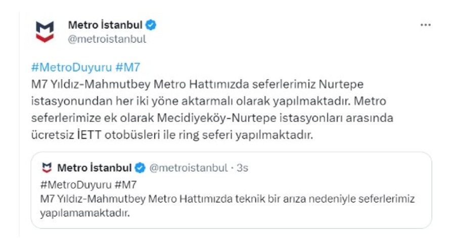 "M7 Yıldız-Mahmutbey Metro Hattımızda seferlerimiz Nurtepe istasyonundan her iki yöne aktarmalı olarak yapılmaktadır. Metro seferlerimize ek olarak Mecidiyeköy-Nurtepe istasyonları arasında ücretsiz İETT otobüsleri ile ring seferi yapılmaktadır"