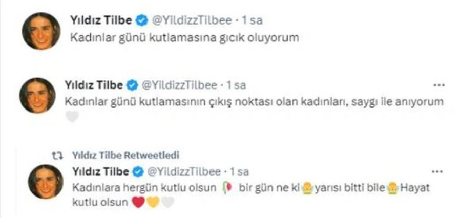 Tilbe, Twitter hesabından yaptığı paylaşımda "Kadınlar günü kutlamasına gıcık oluyorum" ifadelerini kullandı. Kısa sürede paylaşımına onlarca yorum gelen Tilbe, yeni paylaşımlar yaparak "Kadınlar günü kutlamasının çıkış noktası olan kadınları, saygı ile anıyorum. Kadınlara her gün kutlu olsun. Bir gün ne ki, yarısı bitti bile. Hayat kutlu olsun" şeklinde ifadeler kullandı.
